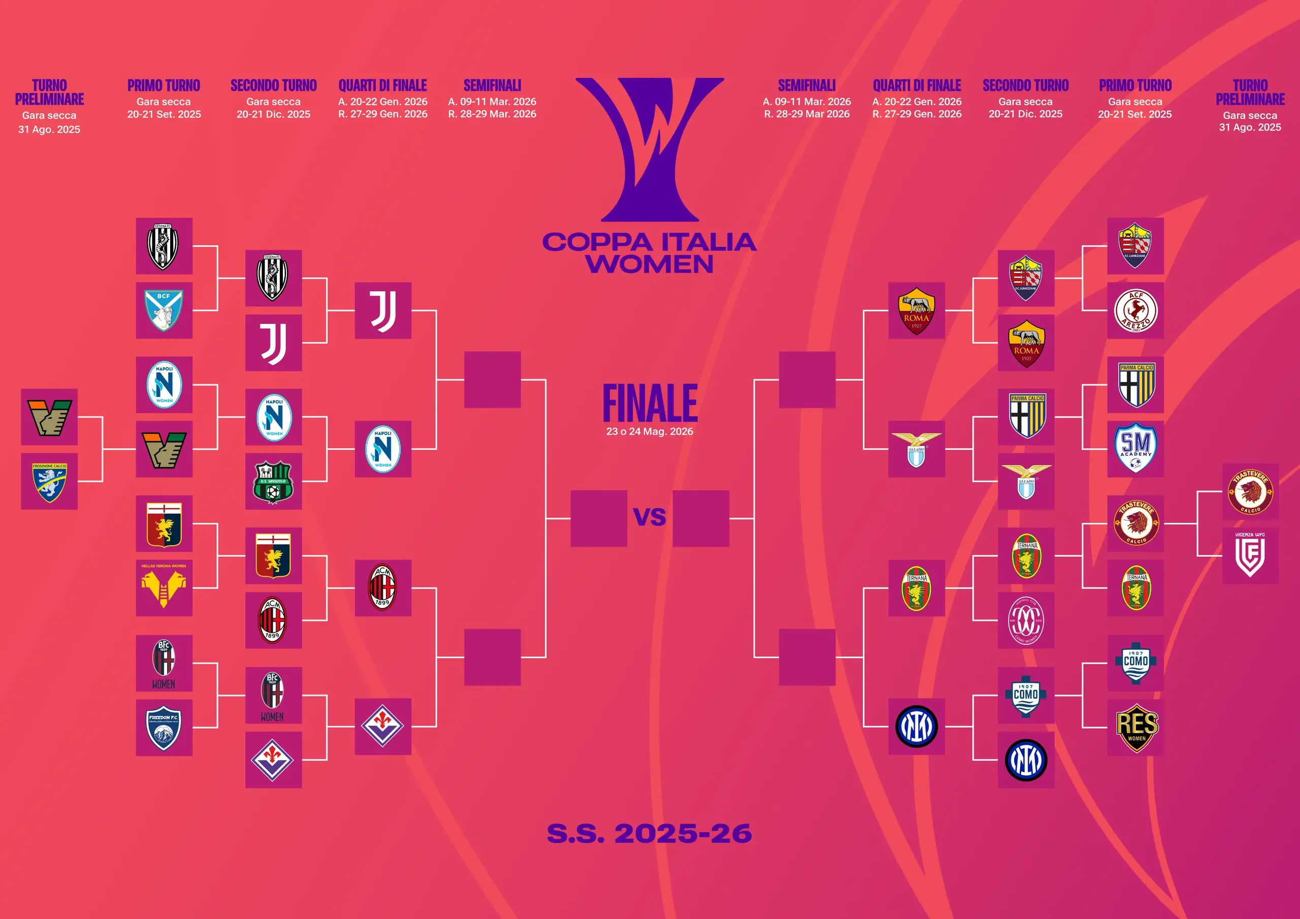 Il Milan ha estromesso il Genoa e darà battaglia, con il vantaggio casalingo in questo match di andata. Juventus e Napoli sono nella parte del tabellone delle Viola, quindi future avversarie in caso di passaggio in Semifinale. Roma, Lazio, Ternana e Inter invece lotteranno nella parte opposta.